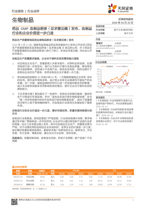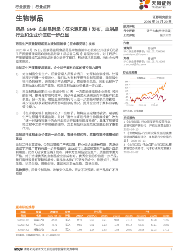【天风证券】【20200420】生物制品行业点评:药品GMP血制品附录(征求意见稿)发布,血制品行业和企业价值进一步凸显-4页
