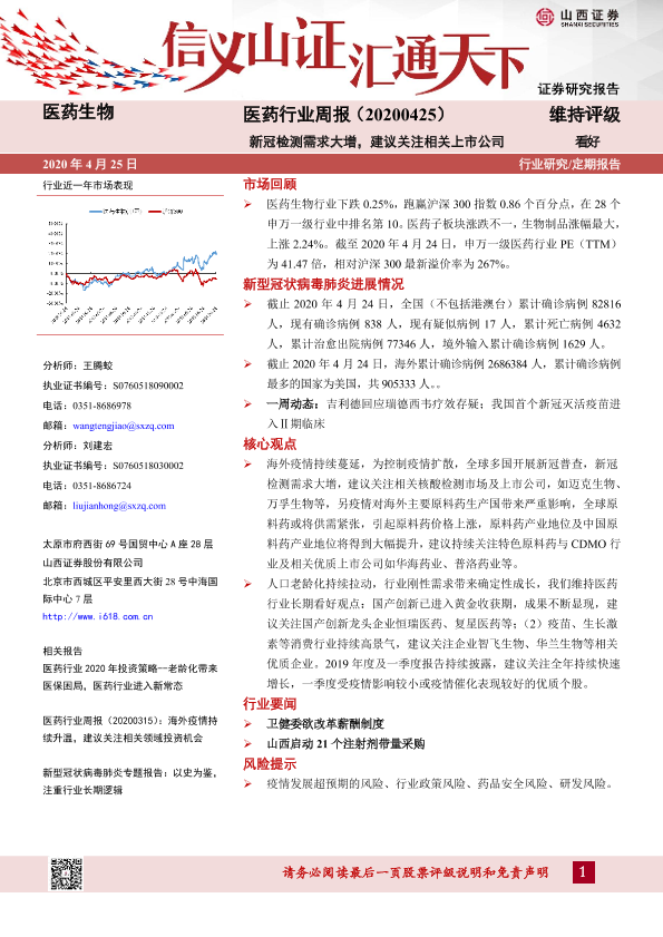 【山西证券】【20200425】医药行业周报:新冠检测需求大增,建议关注相关上市公司-10页