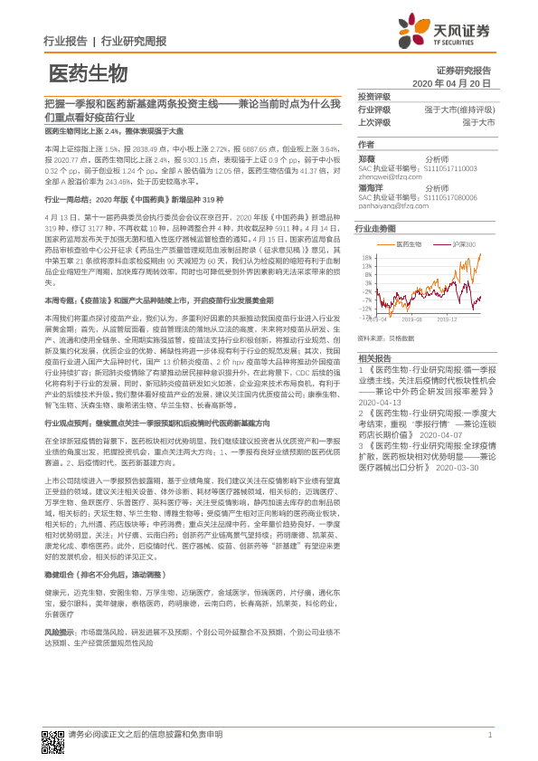 【天风证券】【20200420】医药生物行业研究周报:把握一季报和医药新基建两条投资主线——兼论当前时点为什么我们重点看好疫苗行业-23页