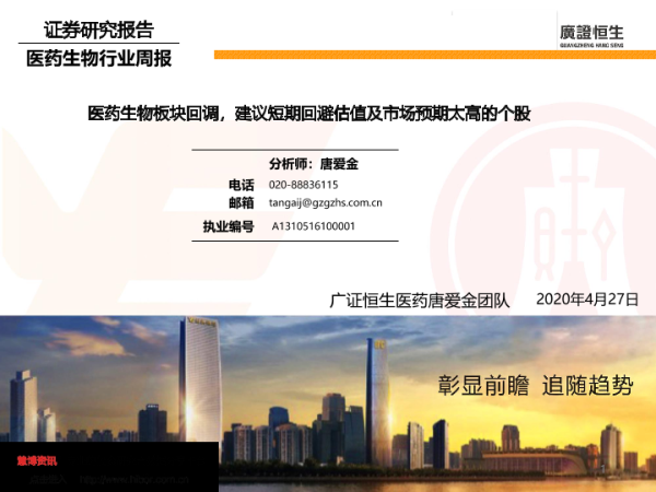 【广证恒生】【20200427】医药生物行业周报:医药生物板块回调,建议短期回避估值及市场预期太高的个股-19页