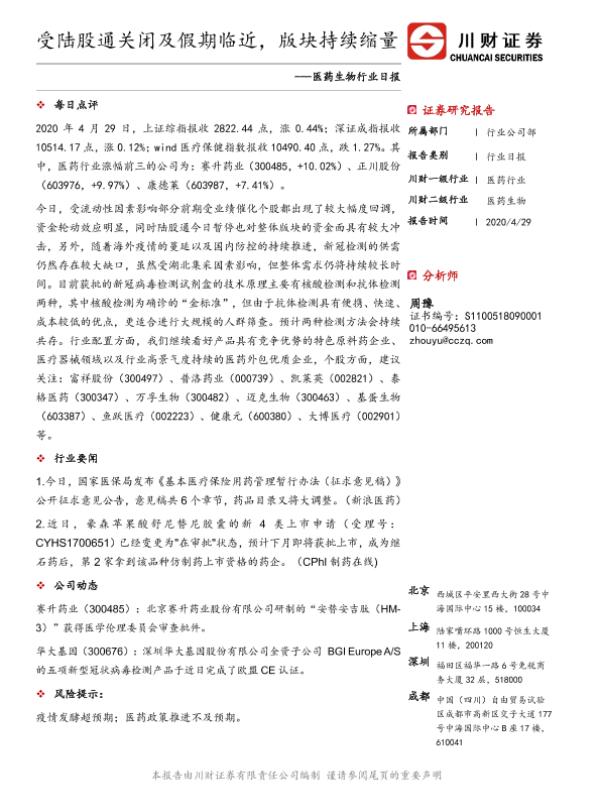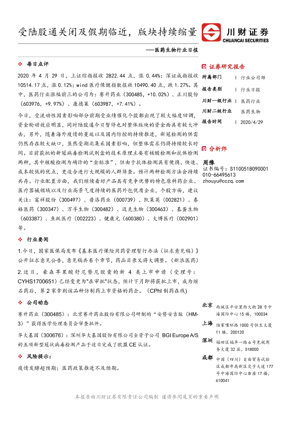 【川财证券】【20200429】医药生物行业日报:受陆股通关闭及假期临近,版块持续缩量-3页