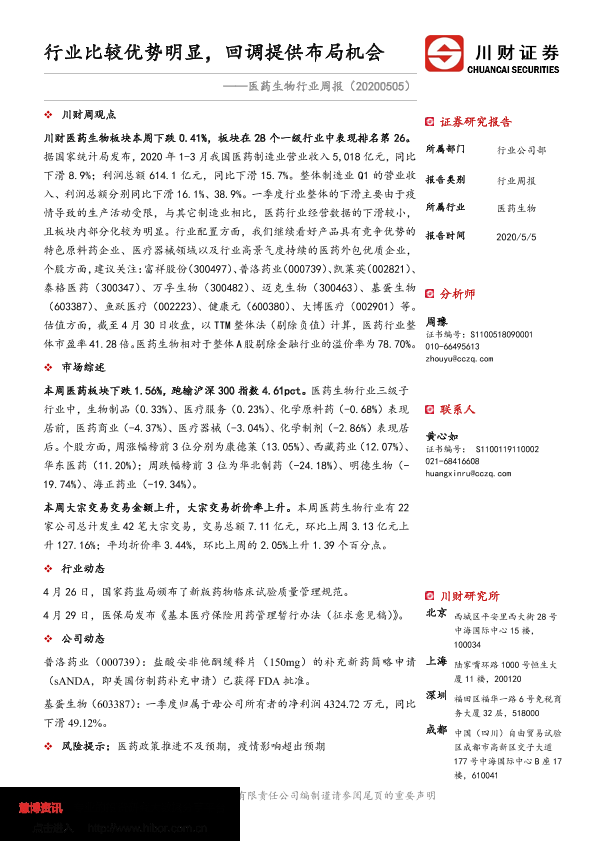 【川财证券】【20200505】医药生物行业周报:行业比较优势明显,回调提供布局机会-13页