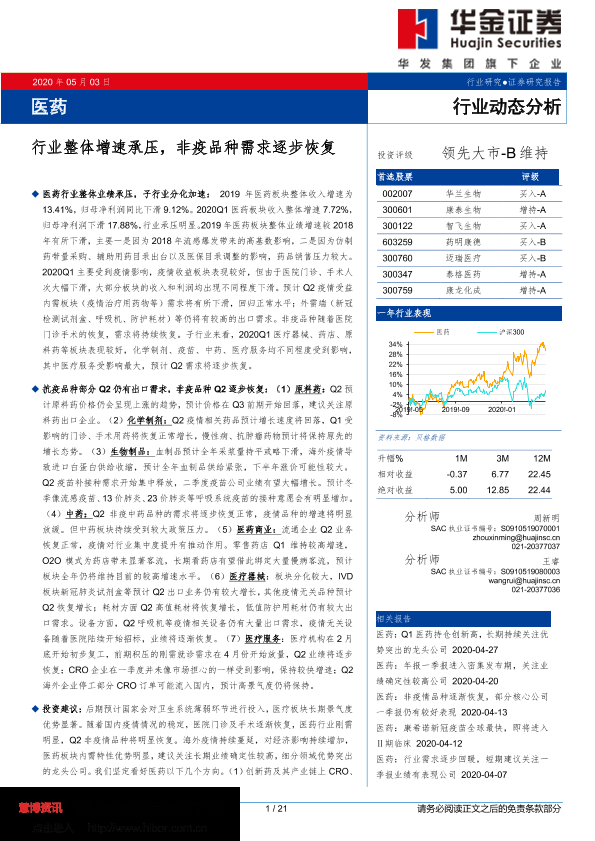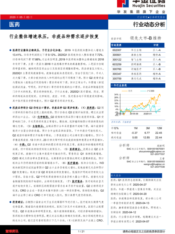 【华金证券】【20200503】医药:行业整体增速承压,非疫品种需求逐步恢复-21页