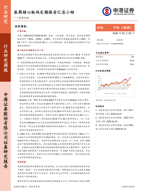 【申港证券】【20200505】医药生物行业研究周报:医药核心板块定期报告汇总小结-20页