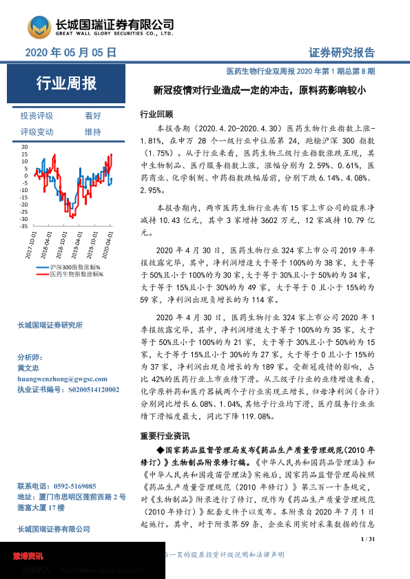 【长城国瑞证券】【20200505】医药生物行业双周报:新冠疫情对行业造成一定的冲击,原料药影响较小-31页