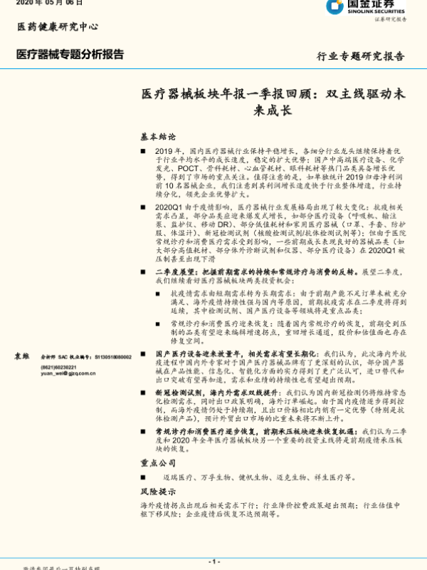【国金证券】【20200506】医疗器械板块年报一季报回顾:双主线驱动未来成长-14页