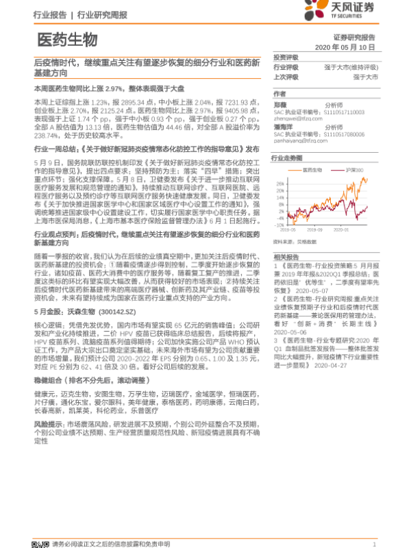 【天风证券】【20200510】医药生物行业研究周报:后疫情时代,继续重点关注有望逐步恢复的细分行业和医药新基建方向-14页