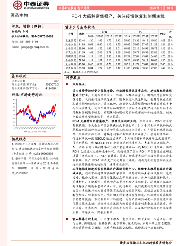 【中泰证券】【20200510】医药生物行业周报:PD-1大癌种密集报产,关注疫情恢复和创新主线-10页