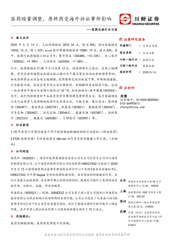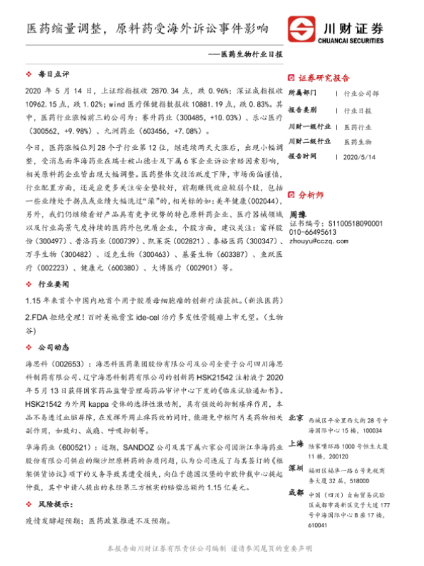 【川财证券】【20200514】医药缩量调整,原料药受海外诉讼事件影响-3页