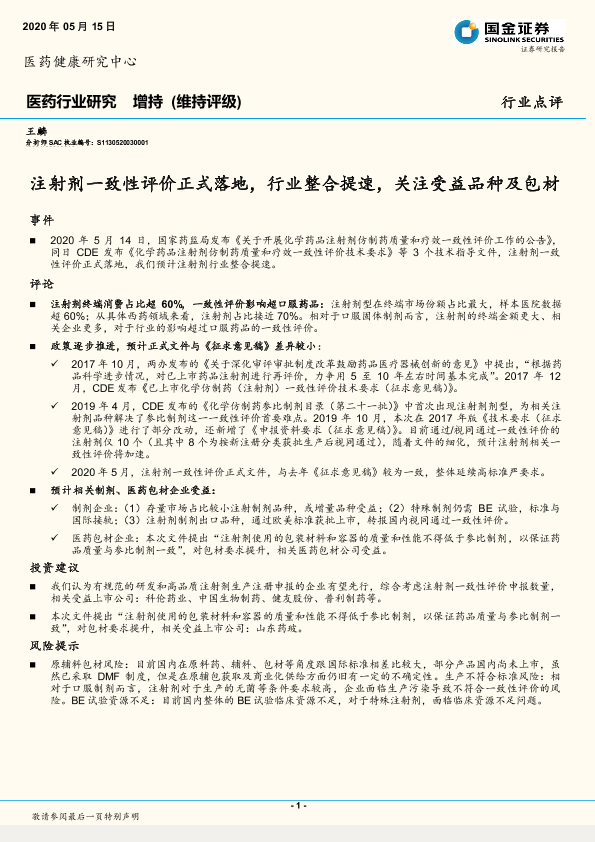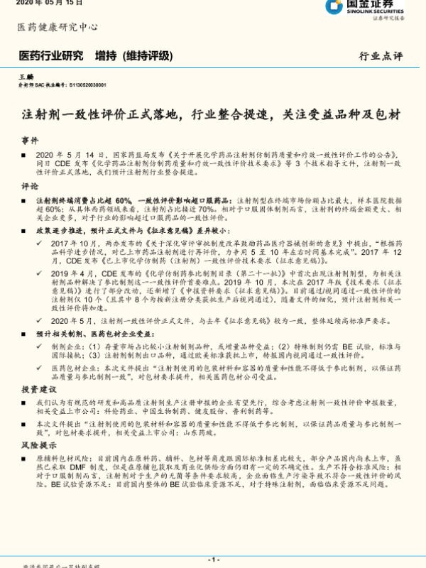 【国金证券】【20200515】注射剂一致性评价正式落地,行业整合提速,关注受益品种及包材-4页