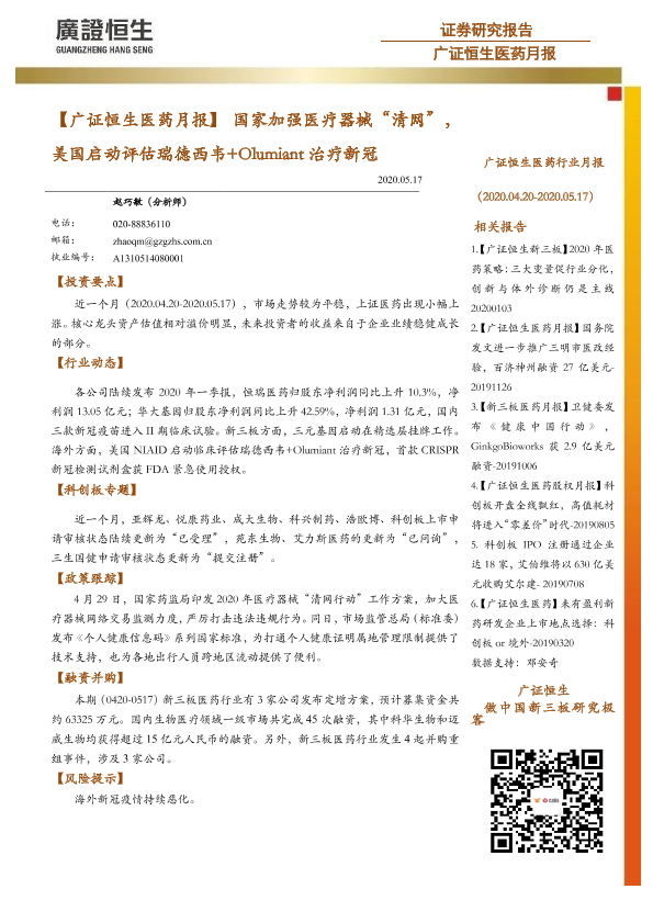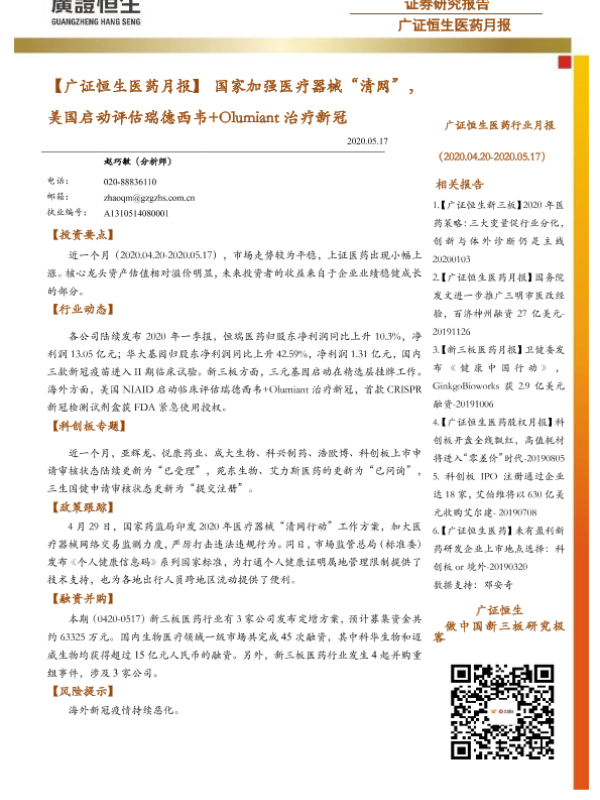 【广证恒生】【20200517】国家加强医疗器械“清网”,美国启动评估瑞德西韦+Olumiant治疗新冠-13页