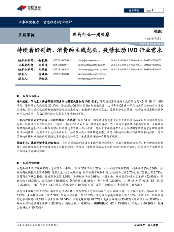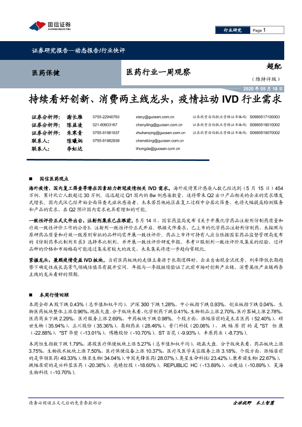 【国信证券】【20200518】医药行业一周观察:持续看好创新、消费两主线龙头,疫情拉动IVD行业需求-7页