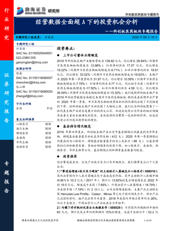【渤海证券】【20200518】科创板医药板块专题报告:经营数据全面超A下的投资机会分析-44页