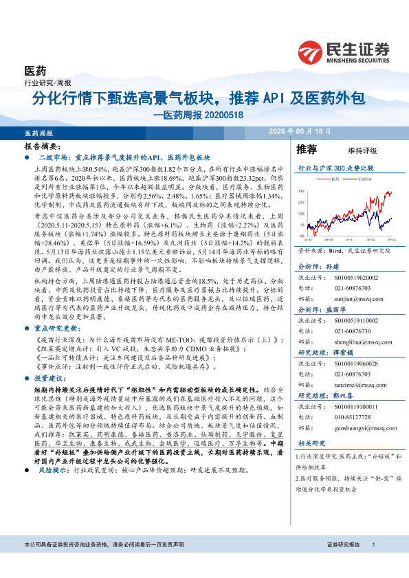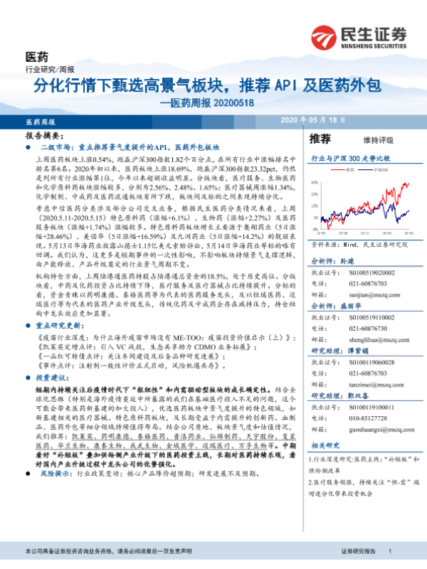【民生证券】【20200518】分化行情下甄选高景气板块,推荐API及医药外包-21页