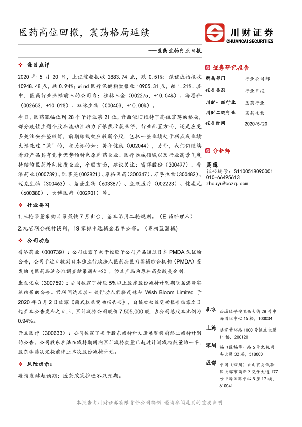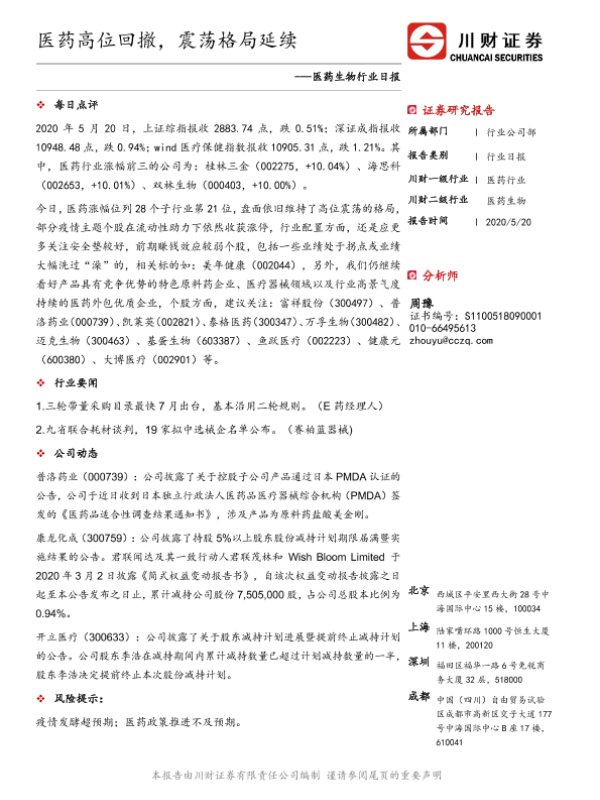 【川财证券】【20200520】医药生物行业日报:医药高位回撤,震荡格局延续-3页