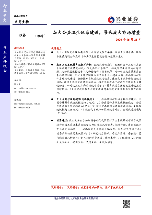 【兴业证券】【20200521】加大公共卫生体系建设,带来庞大市场增量-7页