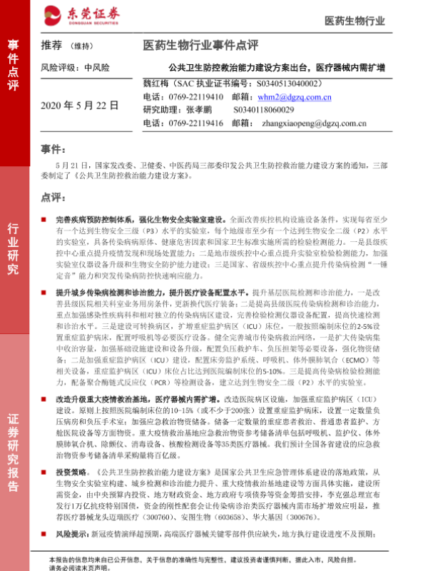 【东莞证券】【20200522】医药生物行业事件点评:公共卫生防控救治能力建设方案出台,医疗器械内需扩增-2页
