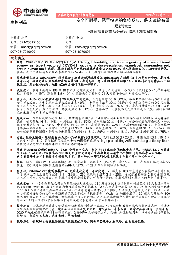 【中泰证券】【20200523】生物制品-新冠病毒疫苗Ad5-nCoV临床Ⅰ期数据简析-5页