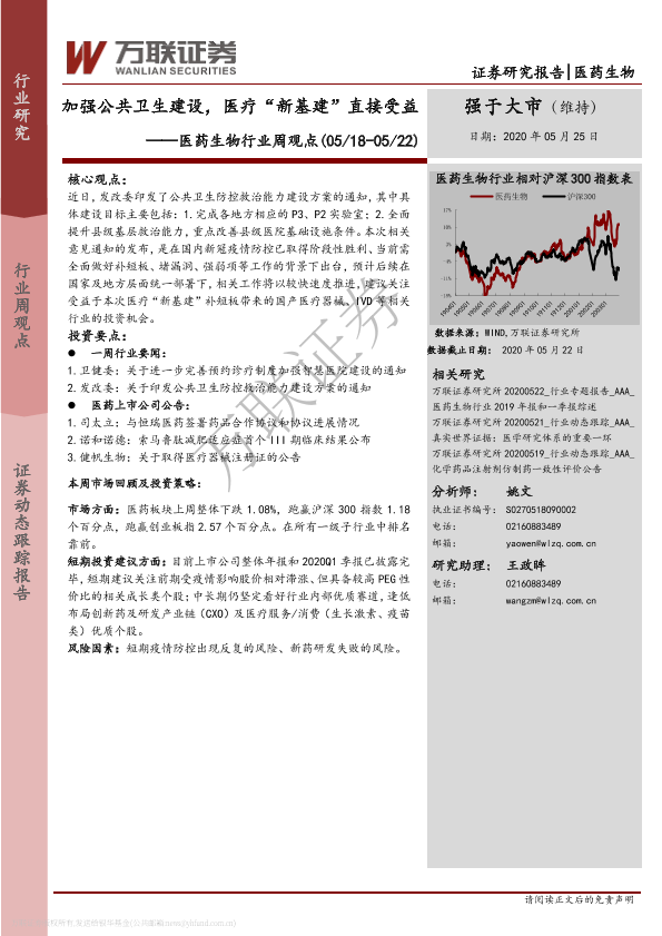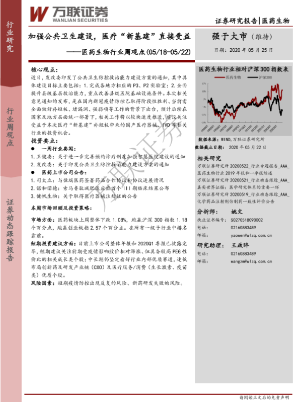 公共卫生建设 医疗新基建 医药生物 政策解读 行业周观点