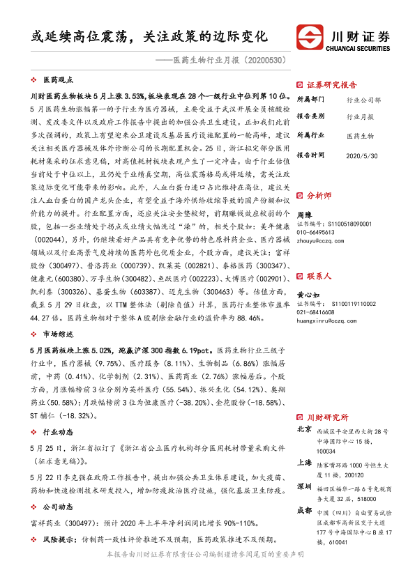 【川财证券】【20200530】医药生物行业月报:或延续高位震荡,关注政策的边际变化-14页