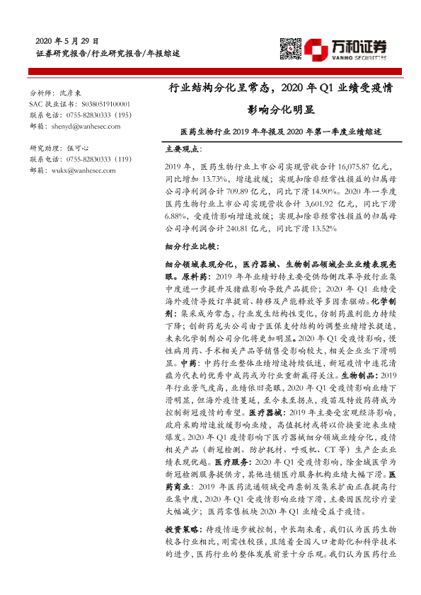 【万和证券】【20200529】医药生物行业2019年年报及2020年第一季度业绩综述-40页