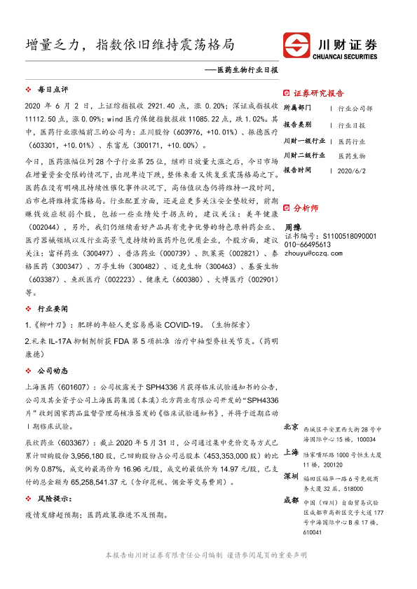 【川财证券】【20200602】医药生物行业日报:增量乏力,指数依旧维持震荡格局-4页