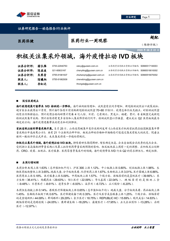 【国信证券】【20200601】医药行业一周观察:积极关注集采外领域,海外疫情拉动IVD板块-8页