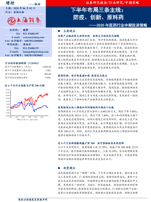 【上海证券】【20200602】2020年医药行业中期投资策略:下半年布局三条主线:防疫、创新、原料药-30页