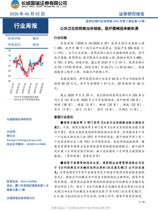 【长城国瑞证券】【20200602】医药生物行业双周报2020年第3期总第10期:公共卫生防控救治补短板,医疗器械迎来新机遇-16页