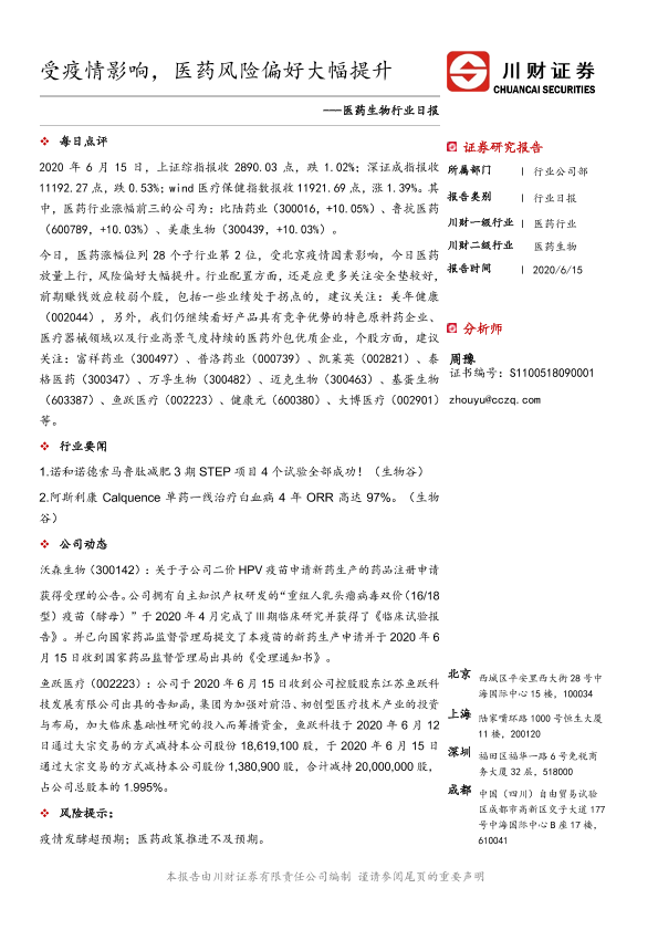 【川财证券】【20200615】医药生物行业日报:受疫情影响,医药风险偏好大幅提升-3页