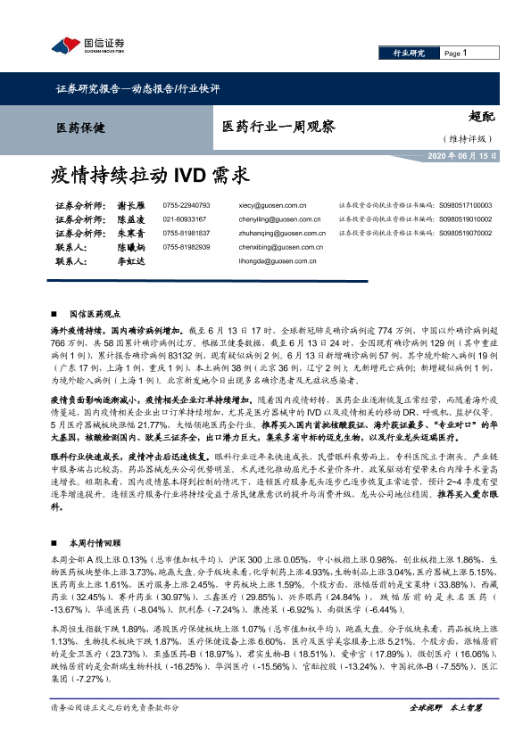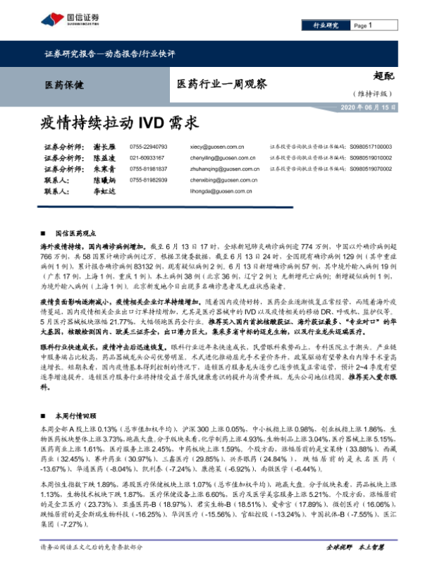 【国信证券】【20200615】医药行业一周观察:疫情持续拉动IVD需求-8页