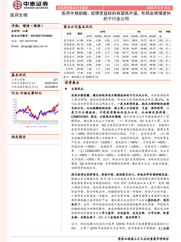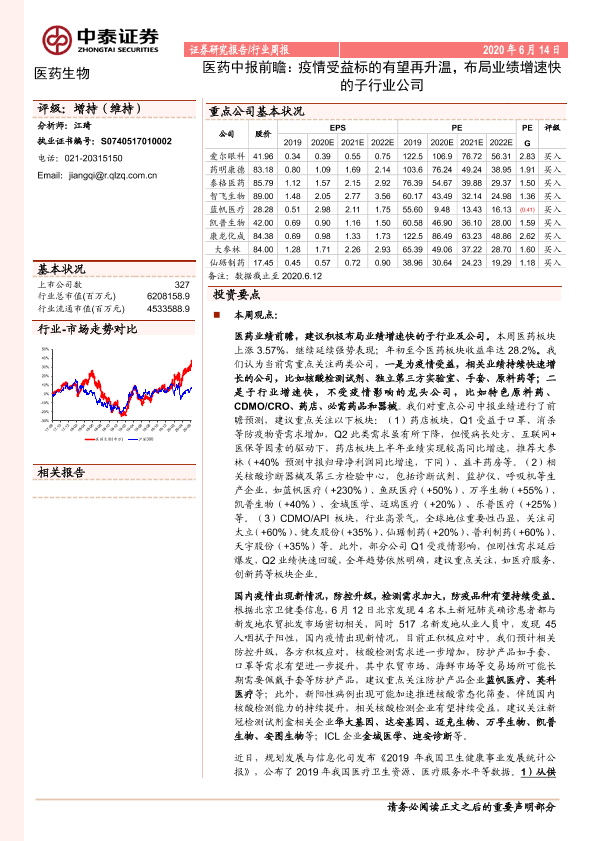 【中泰证券】【20200614】医药中报前瞻:疫情受益标的有望再升温,布局业绩增速快的子行业公司-10页