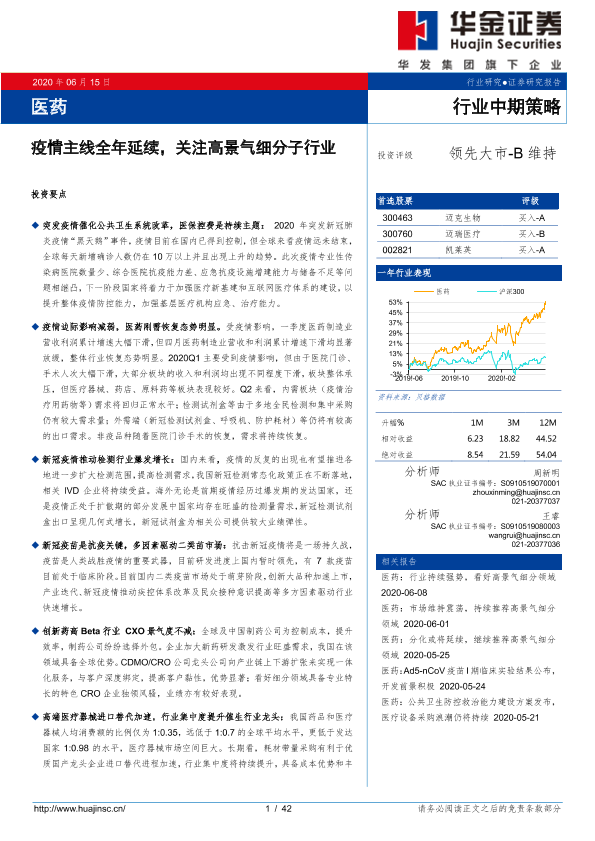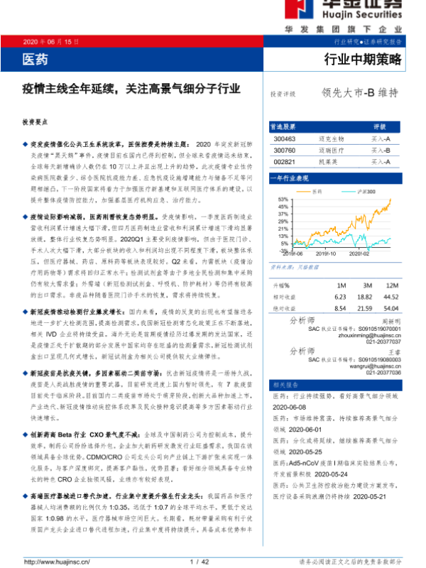 【华金证券】【20200615】医药行业中期策略:疫情主线全年延续,关注高景气细分子行业-42页