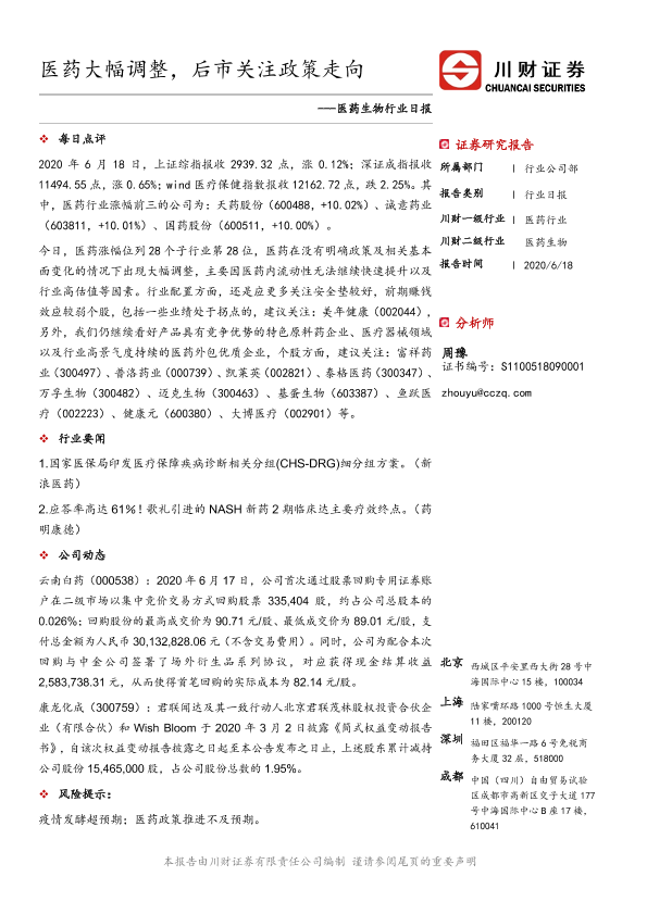 【川财证券】【20200618】医药生物行业日报:医药大幅调整,后市关注政策走向-3页