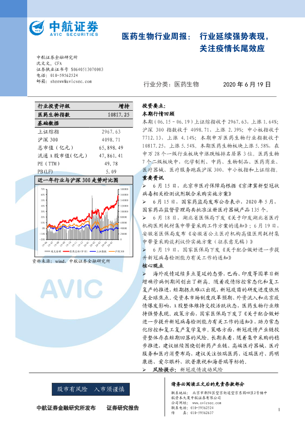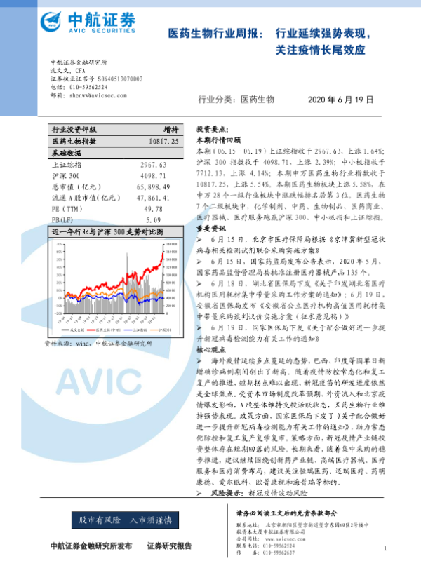 【中航证券】【20200619】医药生物行业周报:行业延续强势表现,关注疫情长尾效应-6页