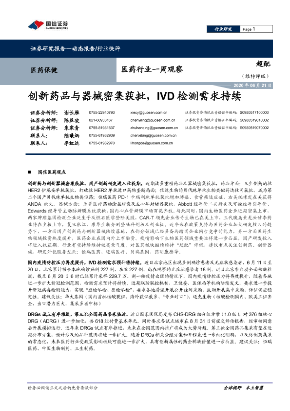 【国信证券】【20200621】医药行业一周观察:创新药品与器械密集获批,IVD检测需求持续-9页