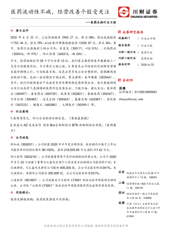 【川财证券】【20200622】医药生物行业日报:医药流动性不减,经营改善个股受关注-3页
