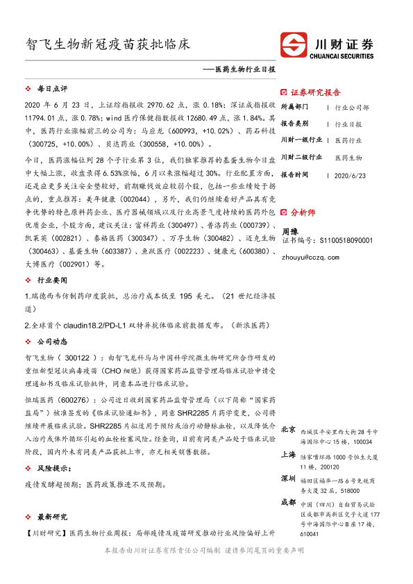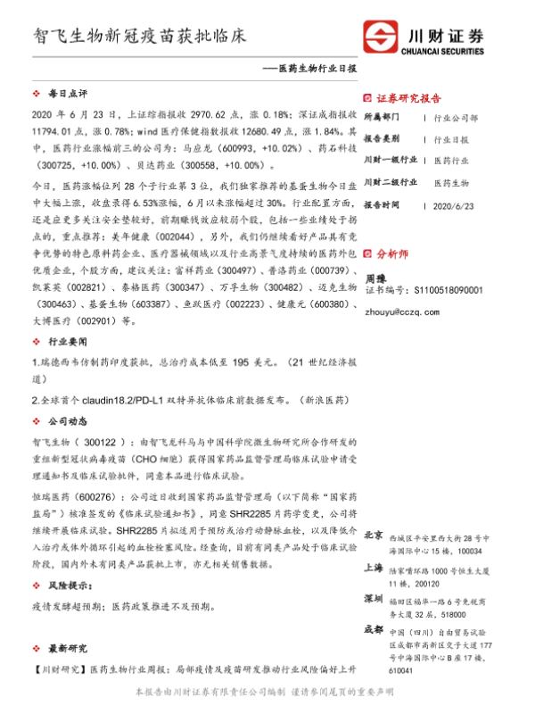 【川财证券】【20200623】医药生物行业日报:智飞生物新冠疫苗获批临床-3页