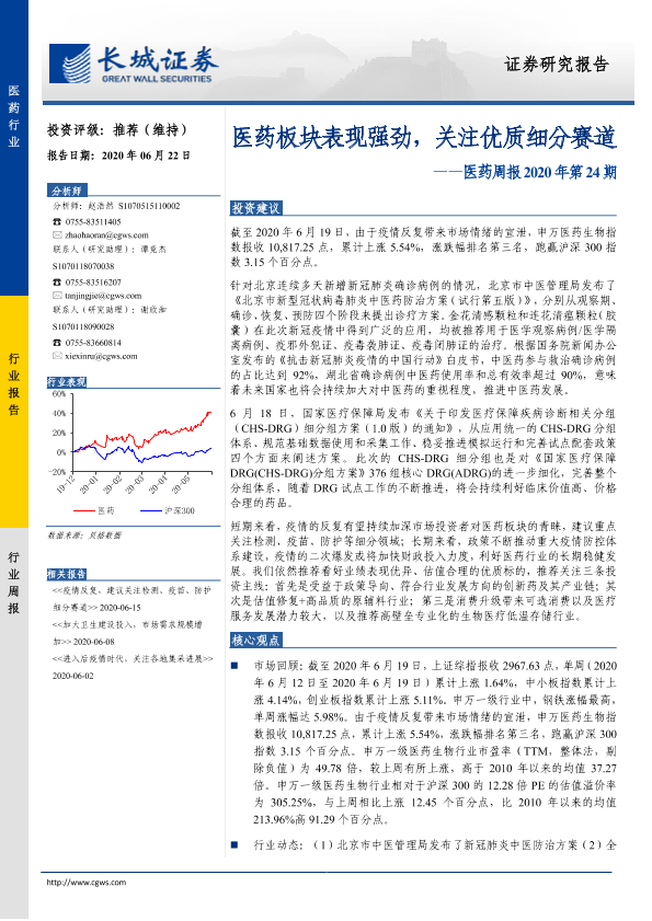 【长城证券】【20200622】医药周报2020年第24期:医药板块表现强劲,关注优质细分赛道-22页