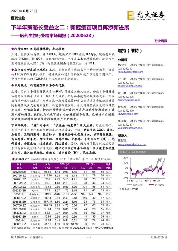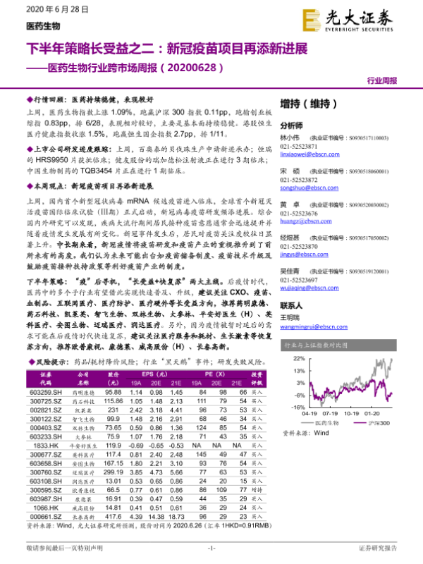 【光大证券】【20200628】医药生物行业跨市场周报:下半年策略长受益之二:新冠疫苗项目再添新进展-36页