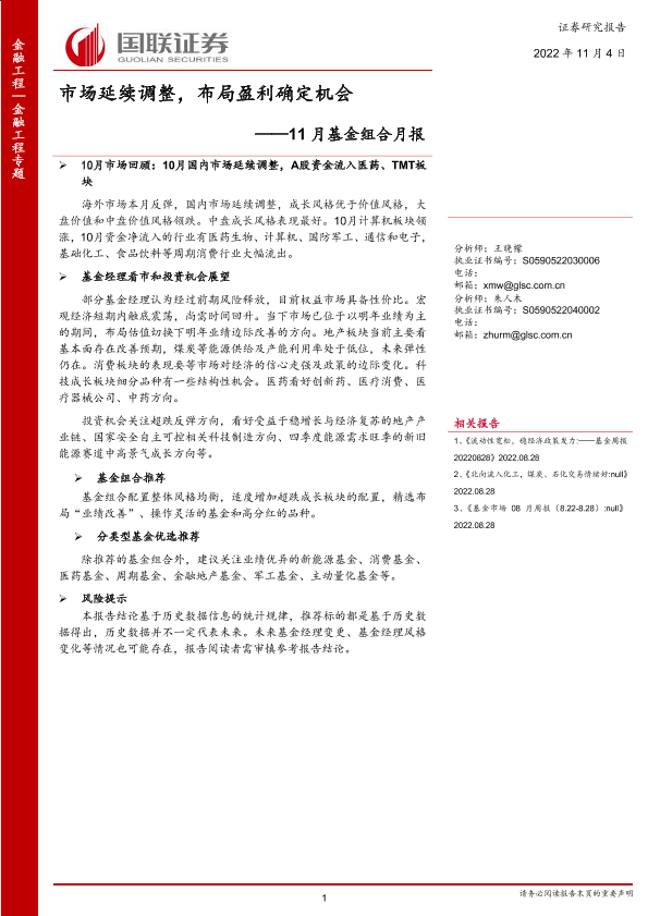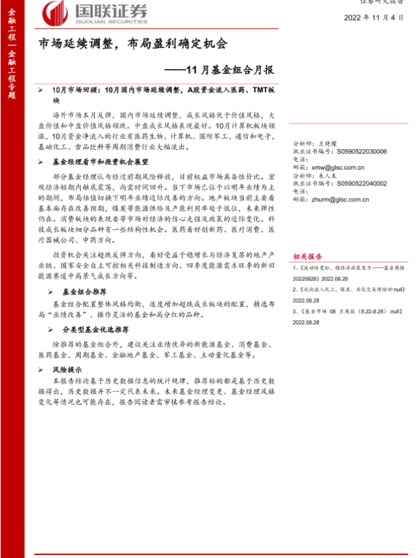 【国联证券】【20221104】11月基金组合月报:市场延续调整,布局盈利确定机会-21页