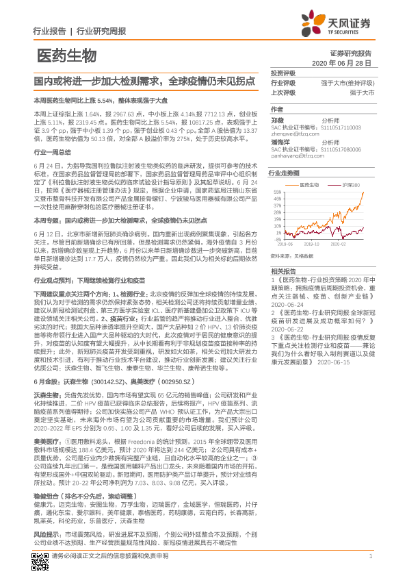 【天风证券】【20200628】医药生物行业研究周报:国内或将进一步加大检测需求,全球疫情仍未见拐点-18页