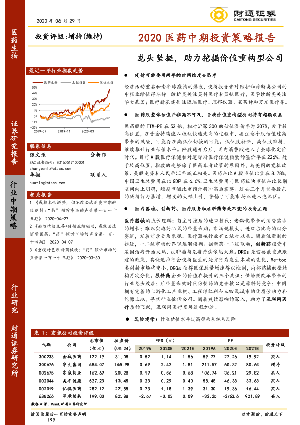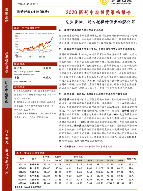 【财通证券】【20200629】2020医药中期投资策略报告:龙头坚挺,助力挖掘价值重构型公司-20页