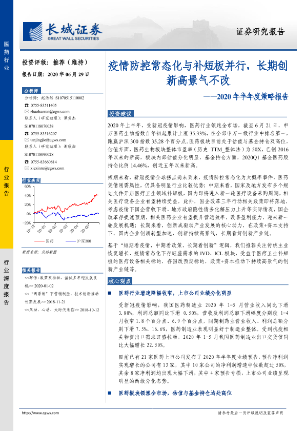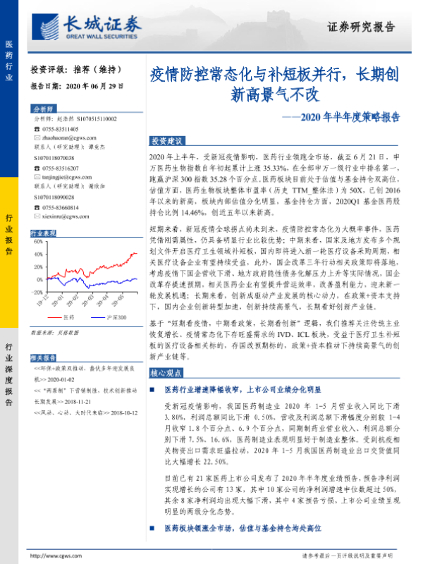 【长城证券】【20200629】医药行业2020年半年度策略报告:疫情防控常态化与补短板并行,长期创新高景气不改-23页