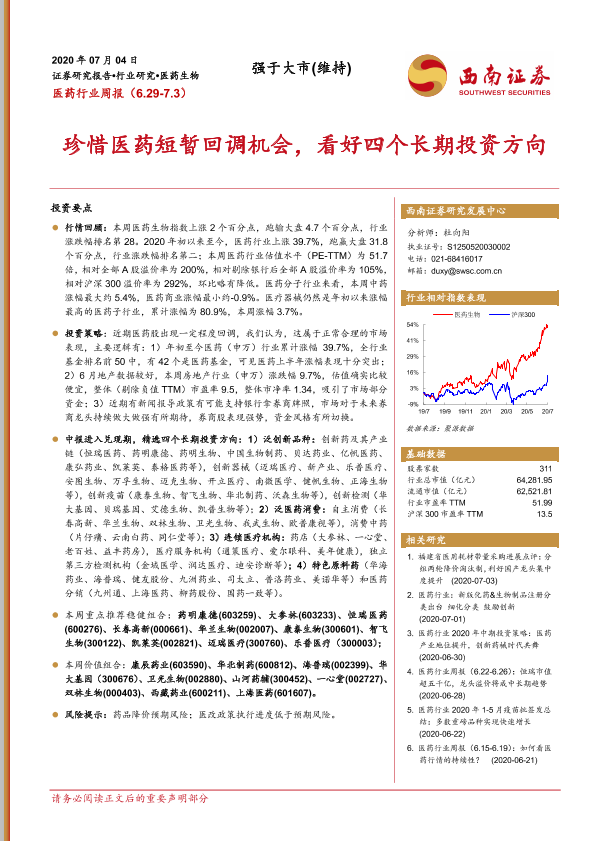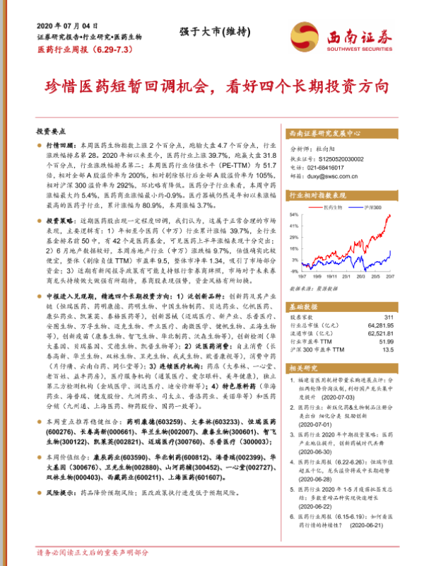 【西南证券】【20200704】医药行业周报:珍惜医药短暂回调机会,看好四个长期投资方向-25页