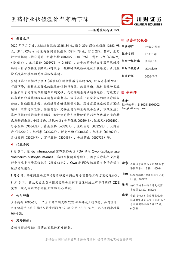 【川财证券】【20200707】医药生物行业日报:医药行业估值溢价率有所下降-3页