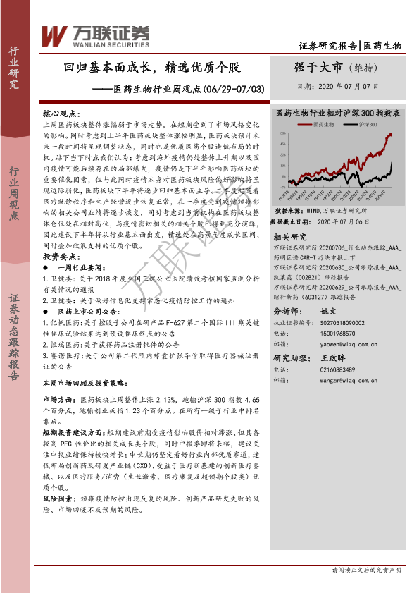 【万联证券】【20200707】医药生物行业周观点:回归基本面成长,精选优质个股-12页