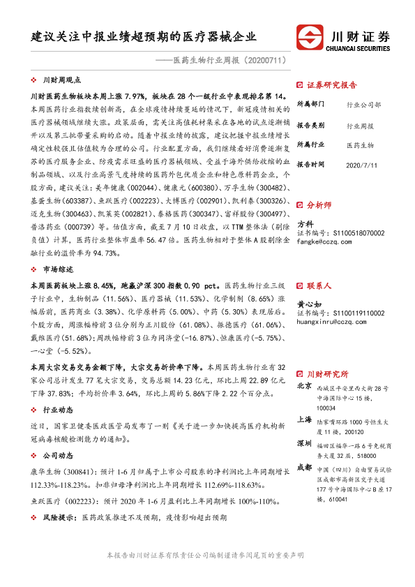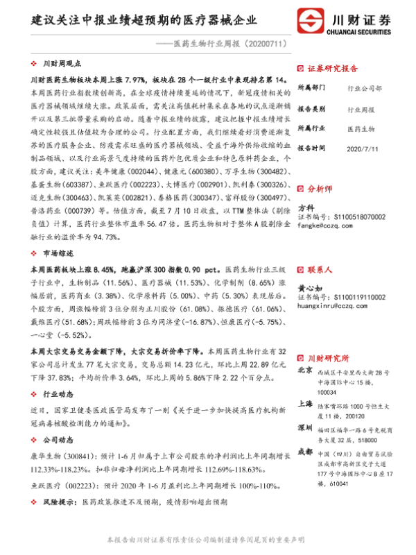 【川财证券】【20200711】建议关注中报业绩超预期的医疗器械企业-14页