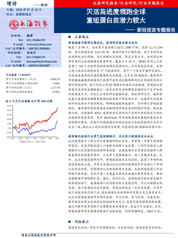 【上海证券】【20200710】新冠疫苗专题报告:灭活苗进度领跑全球 重组蛋白苗潜力较大-32页