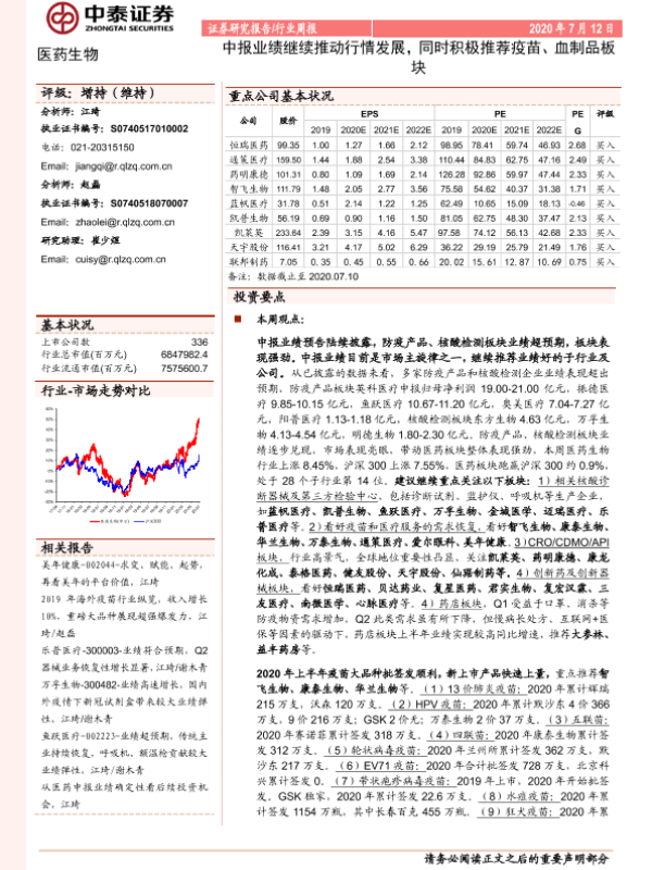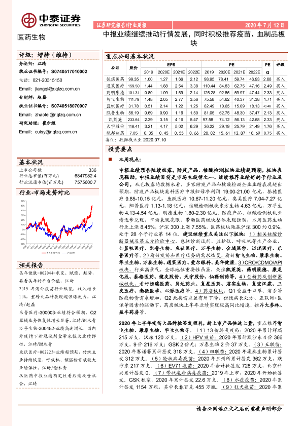 【中泰证券】【20200712】医药生物行业周报:中报业绩继续推动行情发展,同时积极推荐疫苗、血制品板块-12页